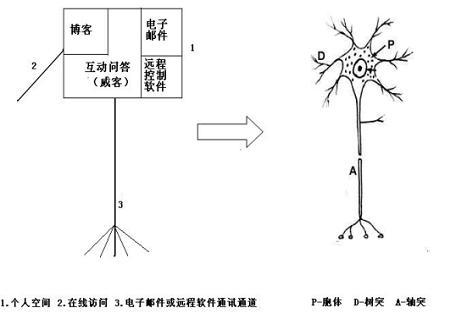 在相關(guān)論文中,我們也繪制了更為詳細(xì)的互聯(lián)網(wǎng)映射型虛擬神經(jīng)元,它是以目前互聯(lián)網(wǎng)個(gè)人空間應(yīng)用為基礎(chǔ),擴(kuò)充并預(yù)言了成熟后的互聯(lián)網(wǎng)神經(jīng)元結(jié)構(gòu)。