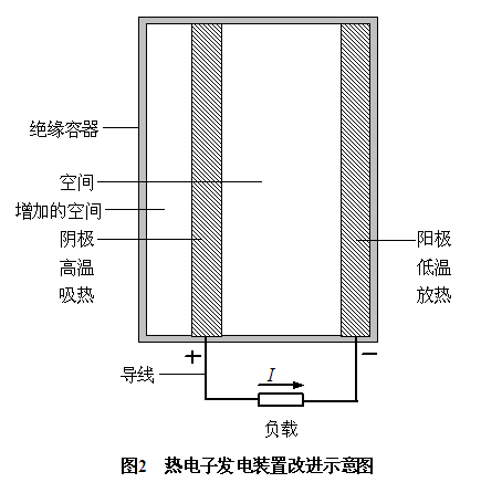 因此,根據(jù)熱電子發(fā)電裝置的工作原理和結(jié)構(gòu),本人想到了如下的提高熱電子發(fā)電裝置的輸出功率和熱電轉(zhuǎn)換效率的方案:在陰極的左表面與絕緣容器的左內(nèi)表面之間增加一個空間(具體參見圖2中的熱電子發(fā)電裝置改進示意圖)。
