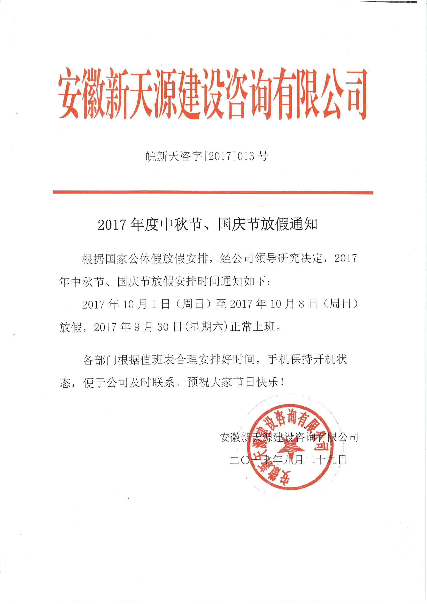 2017年度中秋節(jié)、國(guó)慶節(jié)放假通知