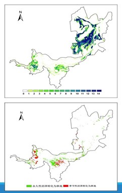 季節(jié)性沼澤減少直接導(dǎo)致珍稀鳥(niǎo)類(lèi)和魚(yú)類(lèi)食物來(lái)源的減少,造成棲息地環(huán)境質(zhì)量下降甚至破壞;季節(jié)性沼澤的喪失和退化將使洞庭湖濕地的生物多樣性降低。最顯著的是西洞庭湖和南洞庭湖區(qū)林地面積的快速增加,主要由沼澤轉(zhuǎn)化而來(lái),如圖,其中永久性沼澤轉(zhuǎn)化為林地共14800 公頃,由季節(jié)性沼澤轉(zhuǎn)化為林地為7900公頃 。