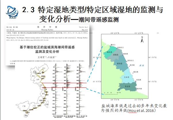 特定濕地類(lèi)型的監(jiān)測(cè)與變化分析,為什么最近在做特定類(lèi)型呢?我們發(fā)現(xiàn)監(jiān)測(cè)濕地變化呢,從無(wú)到有,從原來(lái)不了解,研究了之后發(fā)現(xiàn)我們很多數(shù)據(jù)不足,包括其中很多類(lèi)型沒(méi)有監(jiān)測(cè)到,包括水田用其他的方法補(bǔ)充進(jìn)去了。因?yàn)楹Q鬂q潮的時(shí)候衛(wèi)星每天時(shí)間大概早上5點(diǎn)過(guò)境,但是沒(méi)法監(jiān)測(cè)潮間帶,所以我們對(duì)潮間帶做了監(jiān)測(cè)。
