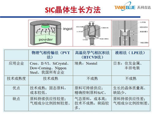 碳化硅襯底的生長方法有三種:一是物理氣相傳輸法,該技術(shù)相對成熟,性價(jià)比高;二是高溫化學(xué)氣相沉積法,優(yōu)點(diǎn)是原料可持續(xù)供應(yīng),可精確控制原料中的碳硅比;三是液相法,尚處于研究階段。