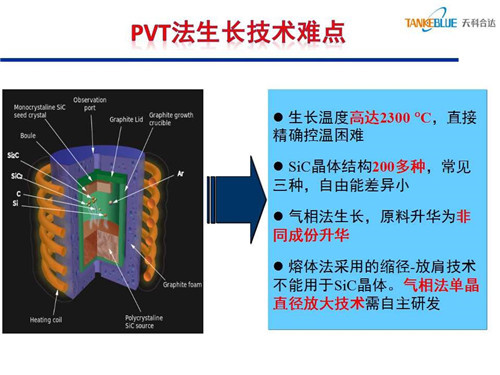 PVT法生長碳化硅存在以下技術(shù)難點(diǎn),一是晶體生長溫度高達(dá)2300℃,直接精確控溫困難;二是很難獲得單一的碳化硅晶體結(jié)構(gòu);三是生長時(shí)原料易升華為非同成份其他物質(zhì);四是熔體法采用的縮徑-放肩技術(shù)不適用于氣相法碳化硅晶體生長,氣相法單晶直徑放大技術(shù)需自主研發(fā)。
