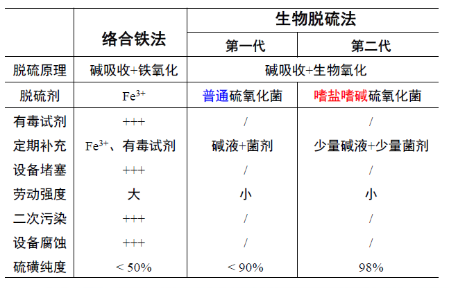 經(jīng)過中試連續(xù)運(yùn)行我們發(fā)現(xiàn)嗜鹽嗜堿硫氧化脫硫體系相比傳統(tǒng)絡(luò)合鐵法具有明顯的優(yōu)勢(shì):極端微生物可耐受的環(huán)境優(yōu)勢(shì)更為突出,僅需定期補(bǔ)充堿液及少量菌劑就可保證整個(gè)系統(tǒng)連續(xù)運(yùn)轉(zhuǎn),勞動(dòng)強(qiáng)度小,且系統(tǒng)回收單質(zhì)硫磺的純度高達(dá)98%。更多內(nèi)容見下表。