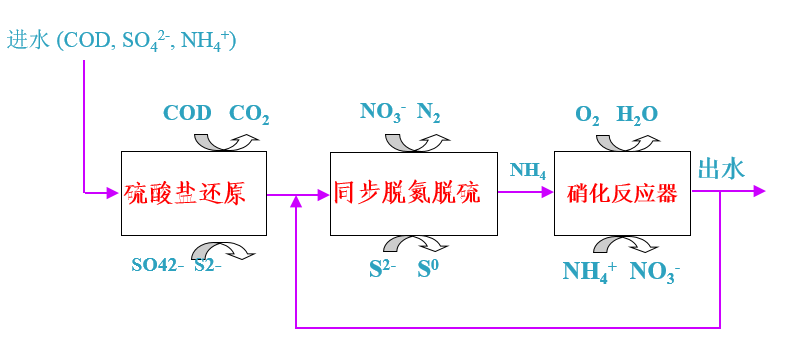 在通常條件下含硫工業(yè)廢水中同時(shí)含有大量的氮素,高含硫含氮也是制藥生產(chǎn)廢水的另一主要特征。隨著生物脫硫技術(shù)與生物脫氮技術(shù)的發(fā)展,通過研究碳氮硫共代謝體系,硫酸鹽的還原產(chǎn)物的生物氧化過程與含氮污染物反硝化過程,相互間的作用關(guān)系,提出了碳氮硫共脫除體系。
