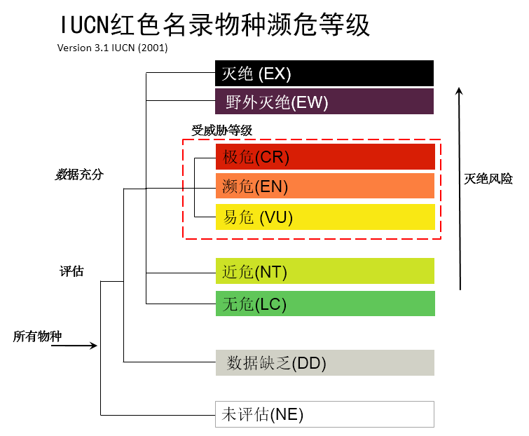 IUCN自20世紀(jì)60年代成立之日起,就設(shè)立了物種生存委員會(SSC),開始編制和印刷《IUCN瀕危物種紅皮書》,后來隨著評估物種的增加,印刷版逐步發(fā)展為網(wǎng)絡(luò)版的《IUCN瀕危物種紅色名錄》,定期編制發(fā)布。IUCN/SSC研究制定了《IUCN物種紅色名錄瀕危等級和標(biāo)準(zhǔn)》,根據(jù)物種的種群數(shù)量和分布情況等,評估其生存狀況,確定其瀕危等級。IUCN瀕危物種等級標(biāo)準(zhǔn)分為“有評估數(shù)據(jù)”和“數(shù)據(jù)缺乏”兩類,“有數(shù)據(jù)評估”中又分為“滅絕”、“野外滅絕”、“區(qū)域滅絕”、“極危”、“瀕危”、“易危”、“近?!焙汀盁o?!钡?個級別,從“無?!钡健皹O危”,滅絕風(fēng)險逐步上升,瀕危等級逐步增加。瀕危等級標(biāo)準(zhǔn)有5個指標(biāo),分別是種群下降、有限地理分布區(qū)、下降小種群、非常小或非常有限的種群、以及模型模擬等量化分析,根據(jù)這些指標(biāo)的數(shù)量閾值,來評估物種的瀕危等級。